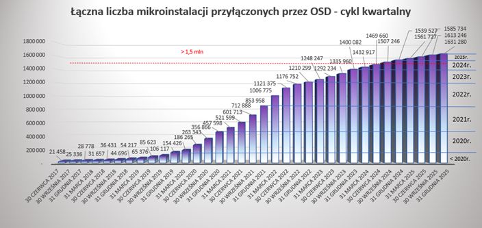 Od początku 2019 roku nastąpił duży wzrost liczby mikroinstalacji przyłączonych do sieci przez OSD w poszczególnych kwartałach, a szczególnie dynamiczny wzrost widoczny jest od IV kwartału 2019 roku. W rekordowym pod względem liczby przyłączeń I kwartale 2022 roku przyłączono więcej mikroinstalacji (152 817) niż w całym 2019 roku (100 212). Był to również rekordowy kwartał pod względem wolumenu przyłączonej mocy, który wyniósł ponad 1 265 MW – co stanowi tylko w jednym kwartale moc większą niż łączna moc wszystkich mikroinstalacji przyłączonych do końca I kwartału roku 2020. Względna liczba przyłączonych mikroinstalacji w IV kwartale 2025 roku zmalała o ponad 34% w stosunku do III kwartału 2025 roku i jest to poziom blisko 1,8 krotnie niższy niż w analogicznym IV kwartale 2024 roku. Ogólnie cały 2025 rok cechuje się znacznym spadkiem przyłączanych mikroinstalacji w stosunku do 2024 roku.