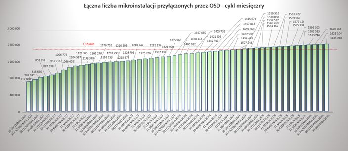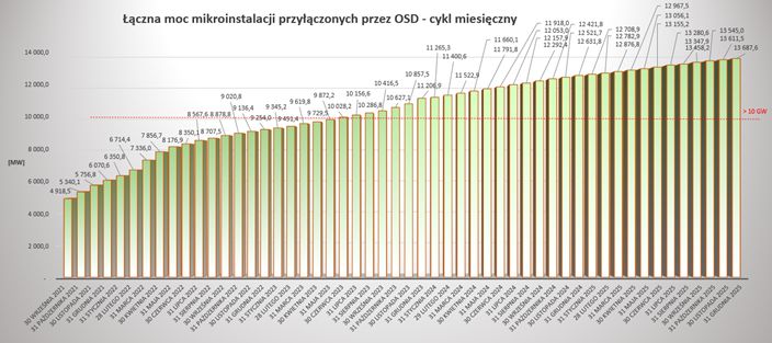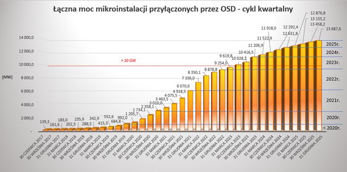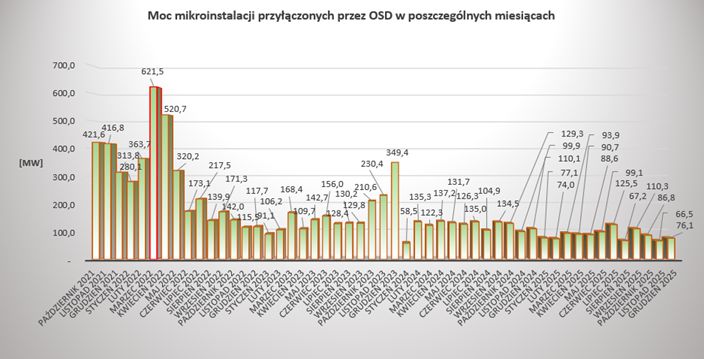 Od początku 2019 roku obserwujemy dynamiczny wzrost liczby mikroinstalacji przyłączonych przez OSD do swoich sieci elektroenergetycznych. Liczba mikroinstalacji przyłączonych przez OSD od początku 2019 roku do końca grudnia 2025 roku uległa ponad 30 krotnemu wzrostowi (o 2908%), przy jednoczesnym ponad 39 krotnym wzroście mocy zainstalowanej w mikroinstalacjach. W IV kwartale 2025 roku OSD przyłączyli do swoich sieci ponad 18 tysięcy nowych mikroinstalacji o łącznej mocy ponad 229 MW. W maju 2025 roku łączna moc zainstalowanych mikroinstalacji przekroczyła 13 GW. Na koniec grudnia 2025 roku łącznie liczba wszystkich mikroinstalacji przyłączonych do sieci dystrybucyjnej OSD wyniosła ponad milion 631 tysięcy, a ich moc ponad 13,68 GW. W trudnej sytuacji epidemicznej związanej z COVID-19, OSD w 2020 oraz 2021 roku przyłączyli do swoich sieci blisko 7 krotnie więcej mikroinstalacji niż w roku 2019 oraz ponad 5 krotnie więcej niż wynosi łączna liczba wszystkich mikroinstalacji przyłączonych w latach poprzednich. W latach 2020-25 przyłączono mikroinstalacje o mocy blisko 13 krotnie większej niż wynosiła łączna moc wszystkich mikroinstalacji przyłączonych w latach poprzednich. W rekordowym pod względem liczby przyłączeń 2021 roku OSD przyłączyli do swoich sieci ponad 396 tysięcy nowych mikroinstalacji o łącznej mocy ponad 3 GW. Dla porównania w roku 2025 przyłączonych zostało blisko 92 tysiące mikroinstalacji (o ponad 47 tysięcy mniej niż w 2024 roku) o mocy blisko 1,06 GW. W 2025 roku widzimy wyraźny spadek liczby oraz mocy zainstalowanej mikroinstalacji w stosunku do 2024 roku. Spadki te systematycznie są obserwowane od rekordowego pod tym względem roku 2021. Dla zobrazowania kilkuletniego trendu spadkowego liczba przyłączonych mikroinstalacji w roku 2025 zmalała ponad 4,3 krotnie w stosunku do 2021 roku. Od początku 2021 roku do chwili obecnej liczba mikroinstalacji wzrosła o ponad 256%, a moc zainstalowana mikroinstalacji w systemie elektroenergetycznym wzrosła o ponad 354%. W grudniu 2025 roku OSD przyłączyli do sieci ponad 5,1 tysiąca nowych mikroinstalacji o mocy ponad 76 MW. Rok 2025 jest kolejnym rokiem z rzędu od szczytowego 2021 roku, w którym obserwujemy narastającą tendencję spadkową.