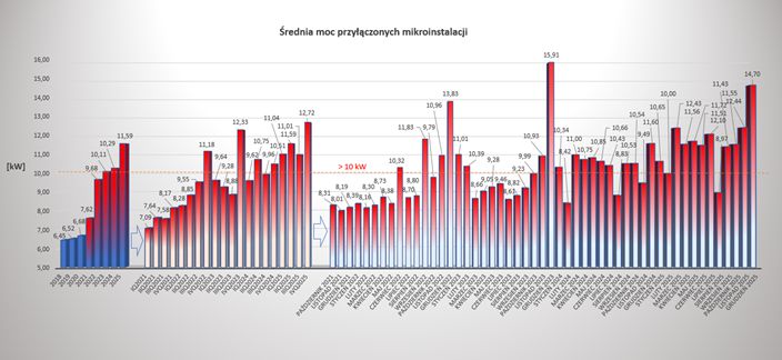 Średnia moc jednostkowa przyłączanych do sieci mikroinstalacji cały czas utrzymuje się na wysokim poziomie. W okresie 2018-2020 wzrosty te były minimalne w stosunku do roku poprzedniego. Natomiast od początku 2021 roku zaobserwować można, że dynamika ta przybrała na sile. W IV kwartale 2025 roku średnia moc przyłączonej mikroinstalacji wyniosła 12,72 kW i była o ponad 6,04 kW wyższa niż średnia moc mikroinstalacji przyłączanych do sieci w roku 2020 (6,68 kW). Dla całego 2025 roku średnia wyniosła 11,59 kW. Dla porównania dla całego 2024 roku średnia moc wyniosła 10,29 kW. Średnia moc przyłączonej mikroinstalacji w grudniu 2025 roku wyniosła aż 14,7 kW i jest to druga co do wielkości największa średnia w historii. Rekordowa średnia moc mikroinstalacji odnotowana została w grudniu 2023 roku i wyniosła aż 15,91 kW. Wysoka średnia moc mikroinstalacji może świadczyć o tym, że po zmianie systemy rozliczeń energii produkowanej w mikroinstalacji od 1 kwietnia 2022 roku i zniesieniu bariery 10 kW dla mikroinstalacji, po przekroczeniu której ulegał zmniejszeniu współczynnik rozliczenia energii „magazynowanej” w sieci z 0,8 na 0,7 wzrosło znacznie zainteresowanie budową instalacji o większej mocy. Częstą praktyką jest także zwiększanie mocy istniejących już mikroinstalacji rozliczanych na starych zasadach. Na wzrost średniej mocy mikroinstalacji może mieć także wpływ przyłączanie magazynów energii do mikroinstalacji, zarówno nowych jak i istniejących, co może zachęcać do instalowania większej mocy nowych / zwiększania mocy istniejących mikroinstalacji. Analizując dane liczbowe należy pamiętać, że w przypadku rozbudowy istniejących mikroinstalacji, które jako istniejące wliczone zostały do statystyki w momencie powstania rozbudowywanej mikroinstalacji, wolumen mocy „dobudowanej” wliczany jest natomiast do statystyki w miesiącu zgłoszenia rozbudowy, co zawyża średnią moc mikroinstalacji dla danego okresu. Obecny trend widoczny od początku IV kwartału 2021 roku wskazuje na zainteresowanie prosumentów przyłączaniem instalacji o większej mocy niż w latach ubiegłych, co niestety nie jest zjawiskiem pozytywnym ze względu na brak w dużej większości przypadków możliwości autokonsumpcji wyprodukowanej energii elektrycznej i świadczy o coraz większym przewymiarowaniu mikroinstalacji.